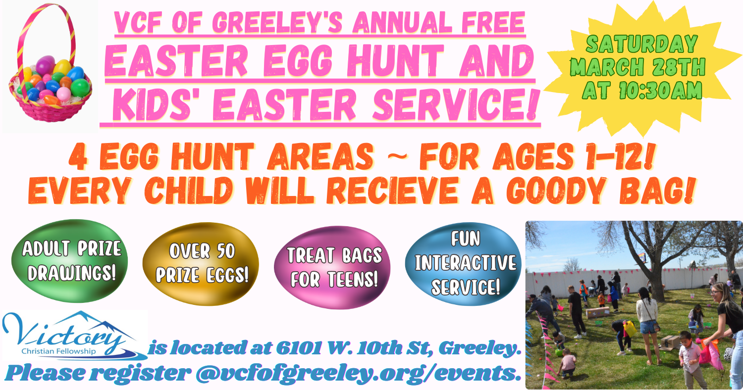 Registration is FREE! Since we have 4 Egg Hunt Areas, please register each child and mark their age group so that we can plan the Hunt Accordingly! Every child will get a Treat Bag when they come in - including teenagers! Parents - by registering online you are automatically entered into the Parent Prize Drawing!